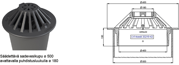 Jupalcon säädettävät EN124 - normin mukaiset sadevesikuvut sisältävät avattavan puhdistusluukun. Puhdistusluukun tarkoitus on helpottaa kaivon tyhjentämistä. Enää ei tarvitse nostaa painavaa sadevesikupua ylös puhdistustöiden ajaksi. Sadevesikuvut ovat varustettu reilulla kankikololla.
