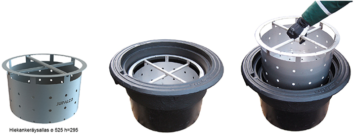 Hiekankeräysallas ø 525 mm h=295 mm ruostumaton teräs.