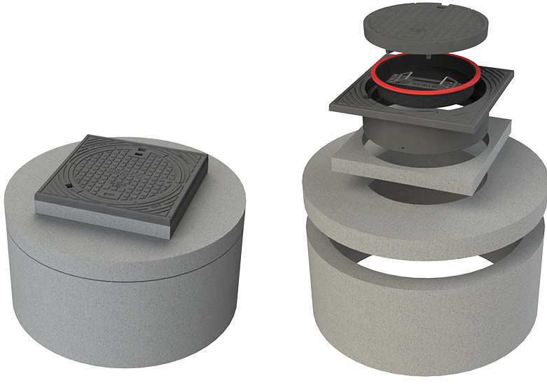 betoninen kuormantasauslaatta asennettuna 500 mm:n ja 315 mm:n muovikaivoille.