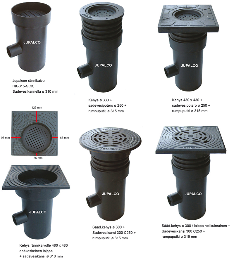 Valurautainen säädettävä kehys 480 x 480 mm Sadevesikansi 310 mm Muovinen rännikaivo Jupalco RK-315-SOK