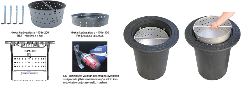 Hiekankeräysallas ø 445 h=100 mm / ruostumaton teräs | 3321951 | | Soveltuu erityisesti mataliin kaivoihin. Pohjaosassa jalkaosat. Voidaan asentaa kaivon pohjalle tai RST - kiinnikkeiden varaan. |