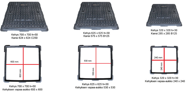 Kehys 320 x 320 h=30 mm Kansi 285 x 285 | B125 (15tn) | 3366703 | 191,00 | Kehyksen ulkolaipan koko 320 x 320 mm. Vapaa-aukko: 240 x 240 mm Kansiston kokonaiskorkeus 30 mm |