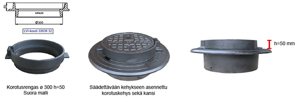 Korotusrengas ø 300 h=50 mm | 3363632 | | Suora malli. Korotus 50 mm Korotusrenkaita voidaan asentaa useampi päällekkäin. |