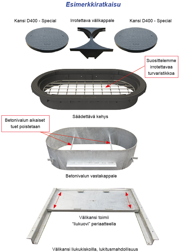 Lisävarusteena on saatavilla mm liukukiskoilla varustettu välikansi sekä turvaristikko joko lukituksella tai ilman. Kehysvalikoimista löytyy ratkaisut niin asfaltti- kuin kivetysalueille.
