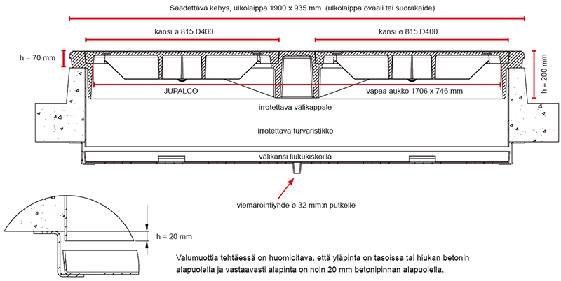 Jupalcon ovaalikaivonkansiston saa myös yhdellä isolla 1200 x 600 mm:n