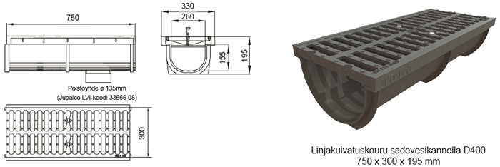 Linjakuivatuskouru VR300P Sadevesikannella D400 Poistoyhde 135 mm | 750 x 300 x 195 | D400 (40tn) | 3366608 | |