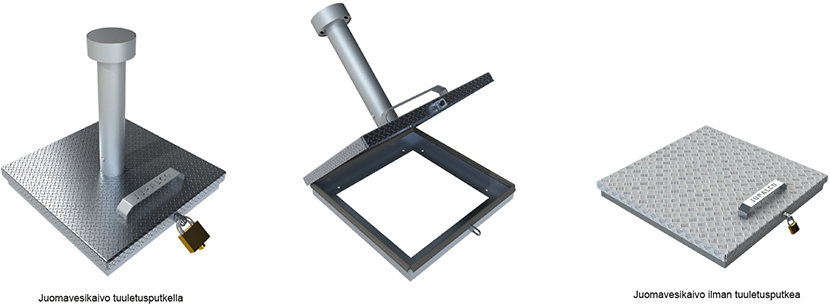 Juomavesikansisto 665 x 665 sopii aukolle max 520 x 520 HST, tuuletusputkella | 3323893 | | Tuuletusputki, nostokahva, saranointi lukitusmahdollisuus (lukko ei sisälly toimitukseen) |